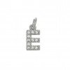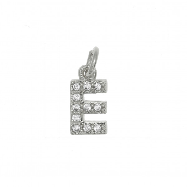 Ciondolo a forma di lettera "E", lungo 9 mm., largo 5 mm., con un anellino tondo chiuso in alto, più un anellino tondo apribile (diametro interno 2,2 mm.), strass colore Crystal, base colore Argento Rodio